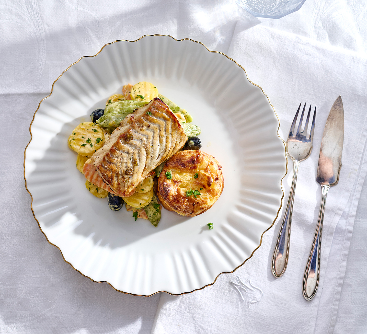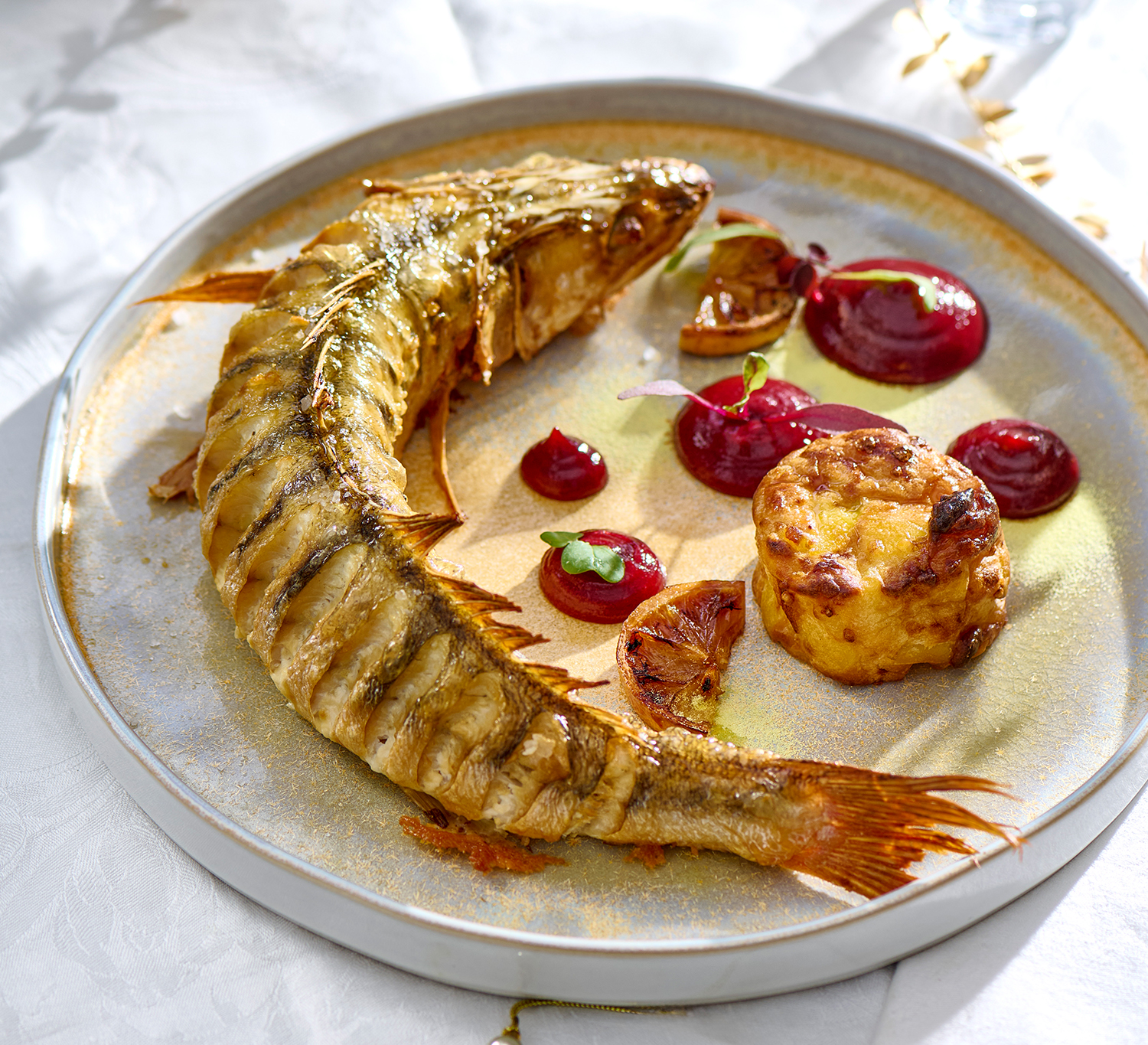 Bazsalikomos tilápia rolád parmezános karfiol velutével és gnocchival