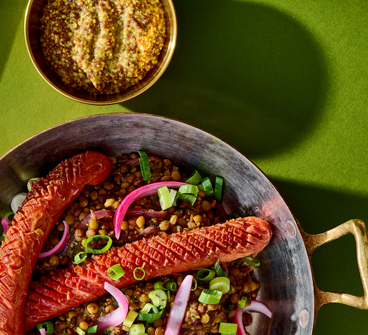 Vörös pesto-s langyos lencseragu sült virslivel