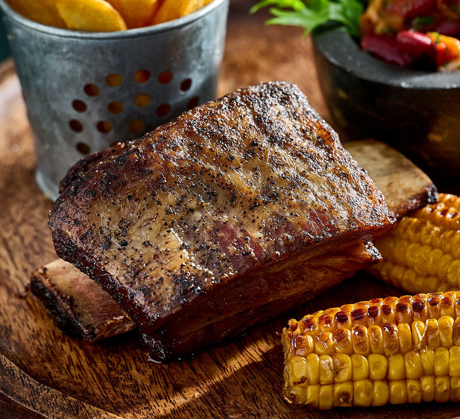 Marha oldalas babos salsaraguval, grillezett kukoricával és pub burgonyával